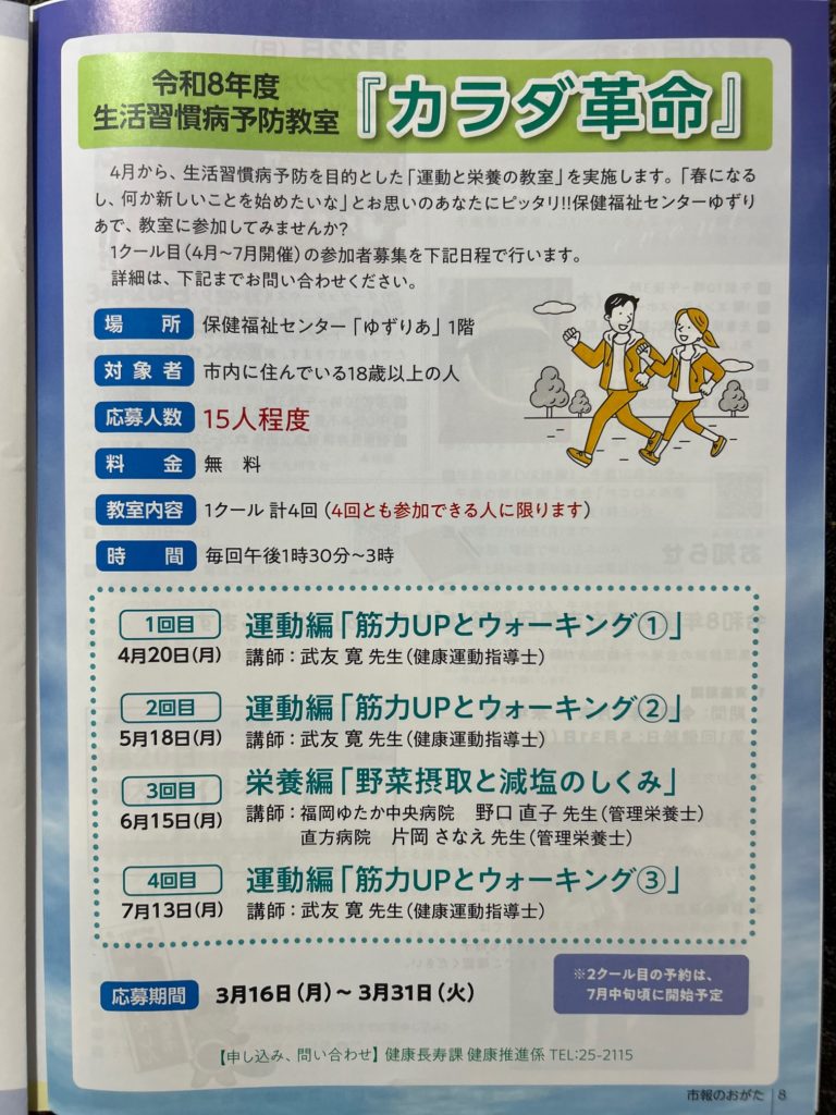 カラダ革命 2026年3月2日 最終更新日時 : 2026年3月2日 try-walk 直方市の保健福祉センター「ゆずりあ」がオープンし、私も4月からの生活習慣病予防教室で指導を行います。少しでも皆さんの健康に携わっていけるように企画していきたいです。まずは参加してくれる方が集まるのか心配です。 \ 最新情報をチェック / FacebookXBlueskyHatenaCopy